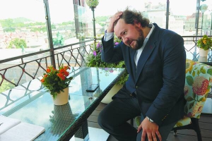 Юлиан идет медленно. Поправляет на ветру кудрявые волосы. Предлагаю осмотреть город с летней открытой площадки на одной из крыш. Чаплинский приглашает подняться на отель "Швейцарский" на ул. Князя Романа. Наверх едем на лифте, на последний уровень поднимаемся по крутой металлической лестнице. Перед нами открывается терраса с цветами, столиками, диванами. Пара в углу - единственные гости. С трех сторон за стеклянным ограждением - панорама старого Львова. Веет легкий ветер. Садимся за столик посредине.