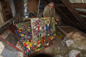 На чердаке темно, с потолка свисает паутина. Работы лежат в картонных ящиках. Несколько десятков свернуты в трубки и расставлены под стенами. Накрыты тряпками и разорванными пакетами.