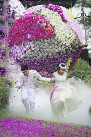 Тайцы Прас и Варуттон Рангситвонг убегают от шара из цветов, катящегося на них с горы во время празднования свадьбы в таиландской провинции Прачинбур.