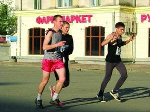 Студент львовского Политеха Владимир Ковалик затягивает песню фанатов футбольного клуба "Карпаты": "Гей, до гори зелено-білі прапори ". Потом "Ой у лузі червона калина ". Говорит, пение помогает настроиться на бег.