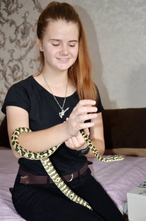 - Леона купили в прошлом году в октябре за 1,3 тысячи гривен, - девочка берет Леона на руки. Он обвивает ее запястье. — Ему было четыре месяца, имел в длину 40 сантиметров. Питоны растут до четырех лет. Могут достигать двух метров. Периодически Леон меняет кожу. Последний раз сбрасывал ее в июле. Мои друзья сначала боялись брать его в руки. Думали, что скользкий. Но кожа у него приятная на ощупь. Кормлю Леона крысами. Покупаю замороженные. Одной ему хватает на 10 дней. После обеда Леон несколько дней должен побыть в покое, чтобы пища переварилась.