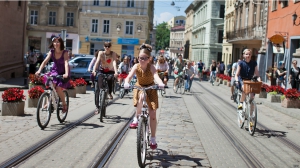 Девочка на велосипеде едет по центру Львова. 9 июня на велопарад собралось 130 участниц. Надели платья и высокие каблуки. Самая молодая 5-летняя велосипедистка приехала на трехколесном. После парада отправились на пикник. Угощение положили в корзины, которые прицепили впереди руля. На следующий день такая же акция состоялась в Ивано-Франковске. Женщин попросили надеть платья в горошек.
