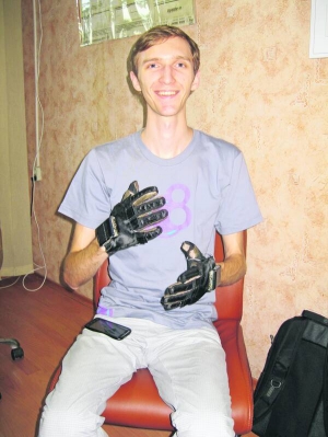 24-летний Антон Степанов появляется через несколько минут. Достает из рюкзака перчатки. Они существуют в единственном экземпляре. Сделаны из обычных велосипедных. Дает подержать. Перчатки не тяжелее кожаных.