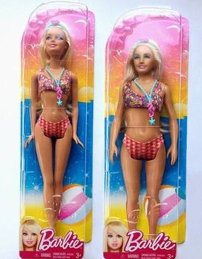 Барби (на фото вверху) имеет параметры 36-18-33 сантиметра. Ее копия — 32-31-33. Также у нее меньшая голова, более массивные шея, талия и бедра.