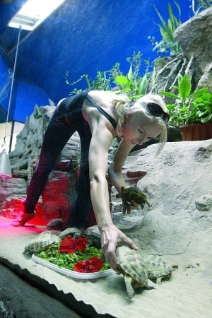 Заведующая акватеррариумом Наталия Орловская насыпает в пластиковый поднос измельченную зелень с тертой морковью. Сверху украшает тремя красными цветами гибискуса. Заходит в террариум и ставит перед двумя игуанами. Сначала съедают цветы.