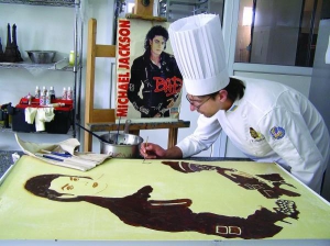 На столе лежит шоколадное полотно. Рядом к деревянному мольберту прикреплен бумажный плакат с изображением Джексона. Штефаньо работает кистью и черным шоколадом. Дорисовывает руку артиста.
