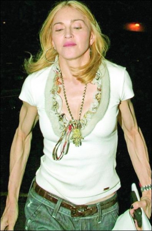 Эксперты говорят, Мадонна перезанималась в спортзале. На ее теле нет ни грамма лишнего жира. Возраст певицы выдают только ее перекачанные руки. Мадонна тренируется шесть раз в неделю по 2 часа. Такой изнуряющий режим назначила ее личный фитнес- тренер Трейси Андерсон.