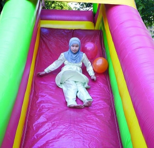 Во дворе центра звучит арабская музыка. Дети спускаются на двух надувных горках. Мужчины и женщины заходят в центр в отдельные двери. Возле мужского входа с дочерью и друзьями стоит Элькхатиб Яссер. В Украине он живет 12 лет.