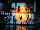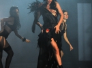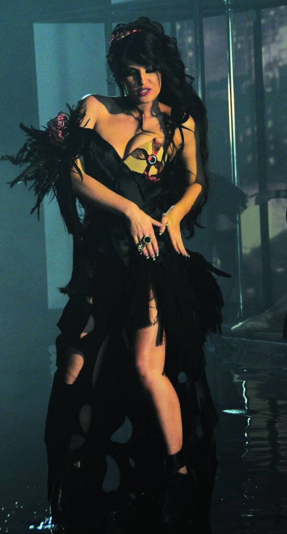 Камалия подходит к бассейну. В это время на металлической конструкции танцуют 20 девушек в черном белье, поднимают ноги до головы.