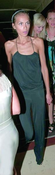 "Мисс Киев-2007" 25-летняя Оксана Островская на одну из вечеринок пришла в майке на бретелях. Кости проступают сквозь кожу, щеки и глаза запали.