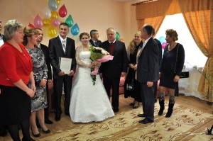 Поздравлять молодых приезжает на джипе городской голова Владимир Хомко, 56 лет. Вручает невесте документы на стиральную машинку. В гостиной стоят запакованные подарки от губернатора и благотворителей - большой плазменный телевизор, пылесос и микроволновая печь.