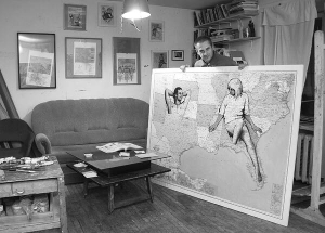 — Ему 63 года. Купил на раскладке в Нью-Йорке. Просили 25 долларов, а отдали за 18. Вон на стене негритянка висит. Я ее нарисовал на странице из этого атласа. Водяными красками или карандашом можно работать прямо по карте. Если рисую маслом, сканирую ее и заказываю печать на полотне. Это стоит 25 долларов за квадратный метр. Раньше клеил карты на полотна с помощью желатина и утюга. Но это медленно и часто берется пузырями.