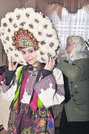 Девушка примеряет свадебный венок из гусиного пера. Его сделала 76-летняя Параска Кушляк из села Великий Ключев на Ивано-Франковщине. Кроме пера, использует бусины, ленты, фольгу, бумажные цветы.