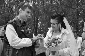 Колонна байкеров отправляется на роспись в Христиновку. В 13.00 начинается церемония. Обручальные кольца молодым подвозит 50-летний байкер Даниил. Перстни вылили из серебра в виде протекторов шин мотоцикла. Роспись в свидетельстве ставят моторным маслом. Вместо шампанского поднимают дубовые бокалы с сидром.