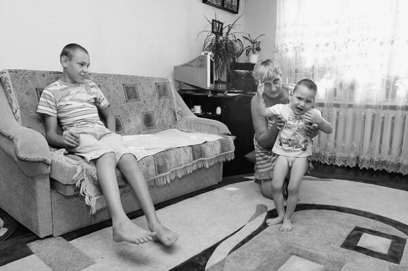 — Смотрю в окно и плачу, потому что на улицу с детьми выйти не могу, — говорит 43-летняя Наталия Стрийнюк из Черновцов. Она воспитывает двоих детей с церебральным параличом — 14-летнего Андрея и Владимира, 3 года. Живет на пятом этаже бывшего общежития кондитерской фабрики. — В доме нет лифта. Вниз еще могу спуститься, а вверх трудно подниматься. Коляску тяну, а старший сам идет и тоже плачет. У него же ножки болят.