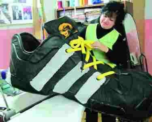 - Ботинок у меня заказал владелец одного спортивного магазина, - рассказывает. - Это задумывалось как костюм для человека-рекламы. Поверх кроссовка планировался носок с логотипом "Адидас", между полосками должна была быть сетка, через которую человек мог бы смотреть. Одевался бы как рюкзак с помощью ремней. Идея заинтересовала. Когда-то на телеканале "Дискавери" видела, как на обувной фабрике их шьют, так что имела представление о деталях.