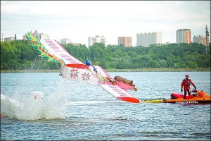 Скрипка летал под желто-голубым флагом. "Летучую вышиванку" столкнули с 6-метровой рампы. Олег держался за металлические перила. Пролетел 8 м и плавно сел на воду.