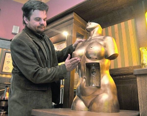 — Как ты думаешь, какой здесь размер груди? Четвертый? — спрашивает львовянин Андрей Бурчак, 25 лет. С друзьями пришел в заведение, фотографируется около скульптуры. — Мне ребята говорили, что тут такое чудо установили. Но я подумал, что пиво из сисек льется. А здесь просто через дыру в животе. Хорошо, что жену не взял, она точно грудь гладить не позволила бы.