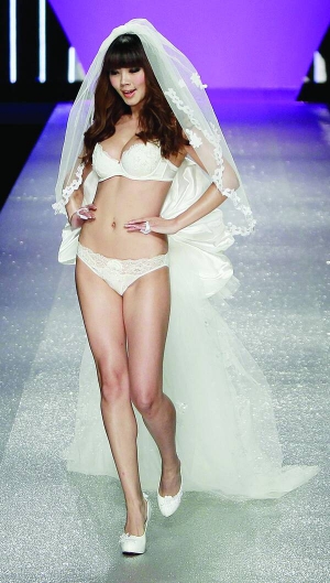 Модель идет по подиуму в белье и фате во время недели моды в Пекине. Новую коллекцию нижнего белья для невест представил Модный дом "Ева".