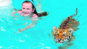За $10 можно посмотреть, как с тигром купается кто-то другой. На плавание можно записаться только утром. Чтобы тигренок не устал, проводят всего 4-5 сеансов в день.