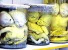 - На такие случаи у меня есть нашатырь, - говорит Владимир Федькив. - Девушкам часто плохо становится, когда видят новорожденных с патологиями. Здесь есть мумифицированные остатки грудного ребенка с врожденными пороками развития, - показывает на полуметровую колбу, в которой скелет ребенка с покрученными конечностями. - Это старейший экспонат этого отдела, ему больше ста лет. Раньше дети с уродствами часто рождались, так как это нельзя было предусмотреть методами ультразвуковой диагностики. Причин много - от плохой экологии до генетических мутаций и кровосмешений. А самый свежий экспонат, ребенка-русалку, нам привезли два года тому назад. Родители были наркоманами, никаких обследований во время беременности женщина не проходила, грудной ребенок родился со сросшимися ногами. Мы сотрудничаем с областным моргом, поэтому если бывают редчайшие заболевания - экспонаты передают нам.