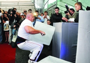 — Нужно хоть 10 минут размяться, растянуть мышцы. А вы задерживаете, — поговорив с телевизионщиками, отмахивается от них. Его просят на камеру показать бицепс. Он картинно начинает ковыряться в носу согнутым пальцем.