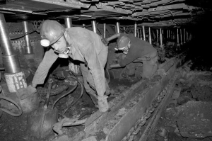 Владимир Новачук, 48 лет, руководит долбильной машиной. Заходим с ним в тоннель высотой больше метра, в ширину — 3 м. Передвигаемся на полусогнутых коленях. Кое-кто ползет на карачках, чтоб не удариться головой. Около угольного пласта садимся за руль долбильной машины. Острыми наконечниками она выковыривает уголь. Шахтеры лопатами нагребают его на конвейер. Работают на коленях.