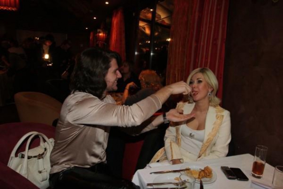 Садится за крайний столик со своим парнем 24-летним Андреем. Он кормит ее блином со свежей клубникой. Режет мелкими кусками, на вилке кладет Екатерине в рот.