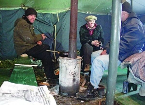 Сидит на лавке с калекой-нищим 53-летним Владимиром Петушком. На одной из двух буржуек - большая сковородка, в ней варят суп. Владимира выбрали старшим по палатке. Он следит, чтобы не затухали печки и не ссорились посетители.