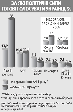 - Партия регионов. Большинство ее избирателей ожидали улучшения жизни, а встретили совсем иное - рост цен, тарифов. Поэтому экономические проблемы больше сказались на рейтинге именно "регионалов", - продолжает Фесенко. - Партия существенно потеряла поддержку в своих базовых областях - на Востоке, Юге. Из-за отсутствия альтернативы избиратели "бело-голубых" идут не на сторону оппозиции, а в категорию тех, кто не определился с политическими предпочтениями или голосуют "против всех". Дно падения рейтинга "регионалов" - около 10 процентов.