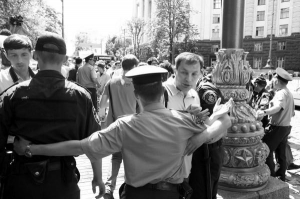 В прошлый четверг руководство страны собралось во дворце "Украина" на торжественные мероприятия по случаю 100 дней президентства Виктора Януковича. Перед началом милиционеры в бронежилетах обступают группу митингующих с сине-желтыми флагами. Оттискивают их за угол. На пустое место запускают несколько десятков сторонников Партии регионов.