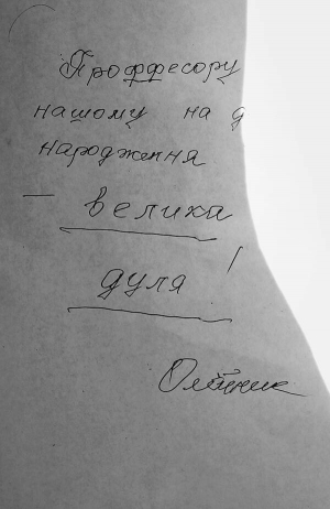 Перед ступеньками Украинского дома стоит картонная коробка "Зроби президенту подарунок". Внутри листы с надписями от руки "Бажаю зручної мотузки та високої шибениці", "Проффесору нашому на день народження — велика дуля!", брошюра "Українофобія. П'ята колона та її ляльководи". Рядом стоит большой серый чемодан.