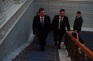 С охранниками заходит Виктор Янукович, 59 лет. Садится перед однопартийцами. 20 мин. критикует Кабмин премьера Юлии Тимошенко: