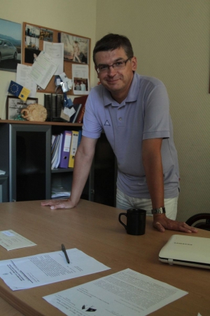 В небольшой комнате прохладно. На стенах развешены фото Тарасюка в Европарламенте. Горбач пьет кофе из большой коричневой чашки и продолжает: