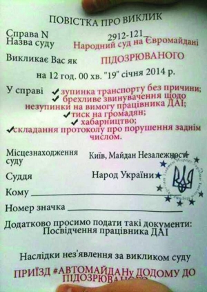 Лидер "Батьківщини" Арсений Яценюк со сцены призывает Сенат США ввести санкции против украинских чиновников, в частности, министра внутренних дел Виталия Захарченко. Автомайдановцы отправляются к президентской резиденции "Межигорье". Подъезды туда блокируют КамАЗами с песком, машинами ГАИ и кордоном "беркутовцев". Пикетчики везли Виктору Януковичу "повестку": вызывают 19 января в 12.00 на народный суд. Ожидают на Майдане Незалежности. Если не появится там, обещают приехать опять.