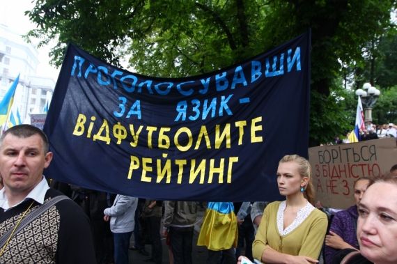 — Я не против русского языка. Но в Украине должен быть один государственный, — говорит в толпе киевлянин 23-летний Алексей Яцика. Бьет в большой барабан. — Если есть общая идея, есть единение народа. Поэтому мы вышли на акцию протеста. Услышат наш призыв или нет — мы не ленивые, еще раз выйдем.
