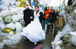 Казалось, что львовский Майдан тождественен киевскому, только больше. В столице убедилась, что СМИ главного не освещают. Вокруг вырастает стена шин, мешков и охрана в шапках викингов. Баррикады. На Крещатике возле мэрии стоит пианино. Народ поет "Смереку". Теперь в этом здании на столах спят жители нового городка, который вырос в сердце Киева.
