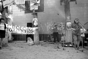 Поддержать политзаключенных приехали группа "Вий", исполняли песни Украинской повстанческой армии, и Сергей Василюк из группы "Тень Солнца". Люди прислушиваются к песням. Аплодируют. После выступления начинают разбирать палатку с аппаратурой и снимать плакаты.