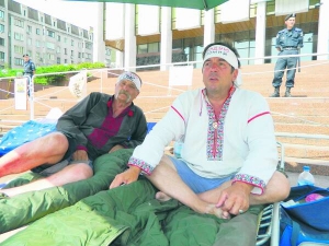 В 11.10 под Украинским домом голодающие лежат на раскладушках - это Ярослав Драган и его жена 52-летняя Леся Дидык, 51-летний Юрий Тимошенко, 58-летний Михаил Пигуляк - все из Коломыи. И виннитчанин 63-летний Леонид Бровченко.