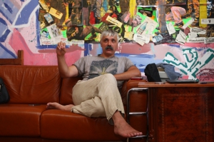 Лидер партии "Братство" 49-летний Дмитрий Корчинський садится на кожаный диван, сбрасывает красные вьетнамки и закладывает левую ногу под правую. Возле него на столике лежат айфон и айпед. По левую руку в углу почти 2-метровая зеленая статуя с лицом, похожим на экс-президента Леонида Кучму. За ней, на балконе, сложены автомобильные шины, поверх которых лежит велосипед.