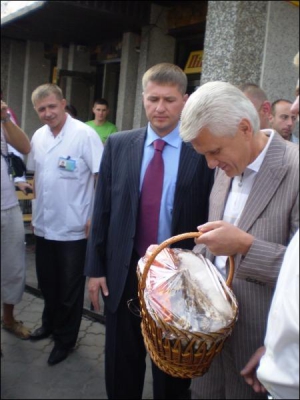На улице гендиректор рынка Евгений Ворко вручает Литвину подарок — корзину с отборными копченостями, колбасой. Спикер достает балык и несет в толпу. Дарит какой-то женщине.