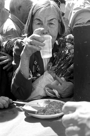 Несколько мужчин с медалями выпрашивают двойную порцию. За водкой становятся в очередь дважды. Но вторично им не наливают, так как заканчивается и каша, и водка.