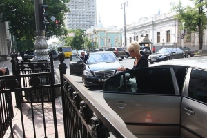 После заседания Рады в 16.00 Оксана Калетник выходит из здания. У забора во дворе припаркован "Мерседес S500" вишневого цвета. Стоит такой более миллиона гривен. Водитель выходит и открывает передние дверцы. Депутат садится.