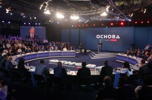 В конференц-зале на экранах показывают промо-ролики "Основы". В 11:00 участники съезда приветствуют лидера "Основы" Сергеяч Таруту и председателя партии Андрея Николаенко.