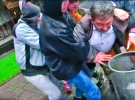 Шуфрича прижимают к зданию. Двое ребят разрывают на нем рубашку. Нардеп вырывается, пытается протолкнуться. Качается. Спускается по ступенькам. Его тянут за руки назад. Бьют в лицо. У Шуфрича выступает кровь, он спотыкается, падает. Его подхватывает страж порядка, который не вмешивался в драку.