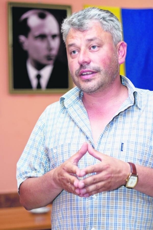 С Юрием Васильевичем встречаемся в областном офисе "Свободы" на ул. Артема. В комнате на стене висят флаги - национальный и воинов УПА. Между ними - портрет Степана Бандеры. Бублик опаздывает на 15 мин.