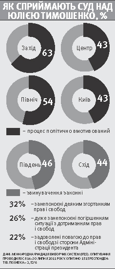 У многих нынешних и бывших сторонников Партии регионов отношение к Тимошенко, как к воровке. Они уверены, что ее надо наказать по принципу "вор должен сидеть в тюрьме". Но фактически все рассматривают это дело не с точки зрения "виновна" или "невиновна", а ориентируются на политический подход. Если против власти, то считают этот суд "политическими репрессиями". Если мы критически относимся к постпомаранчевым силам - "Тимошенко надо посадить".