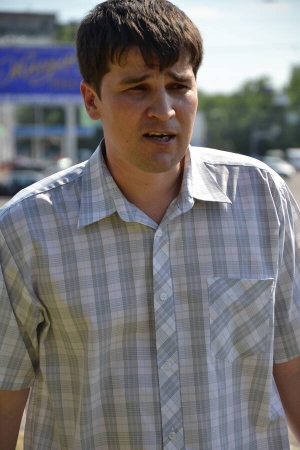Максим Голосной - автор бигборда "Узнала, что внук голосовал за "Регионы" - переписала хату на кота". Встречает нас возле железнодорожного вокзала в областном центре. На нем светлая рубашка с короткими рукавами и джинсы. Провожает к серой "девятке". За рулем - молодой мужчина. Садимся.