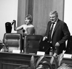 Большинство министерских кресел пустуют. Туда садятся заместители правительственных чиновников. В отпуске до 22 августа и премьер Николай Азаров. Сотрудница Кабмина поправляет табличку главенствующего на заседании первого вице-премьера Андрея Клюева.