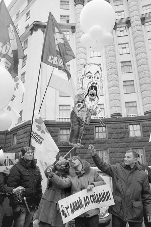 - Это наиболее одиозные представители Кабмина, - говорит в мегафон "свободовец" 24-летний Александр Аронец. - Табачник - обычный украинофоб. Говорили, в молодые годы по музеям крал картины. А теперь хочет красть души украинских людей. Азаров надолго запомнился своим украинско-русским языком. Тигипко показал, что ни о какой социальной политике не думал.